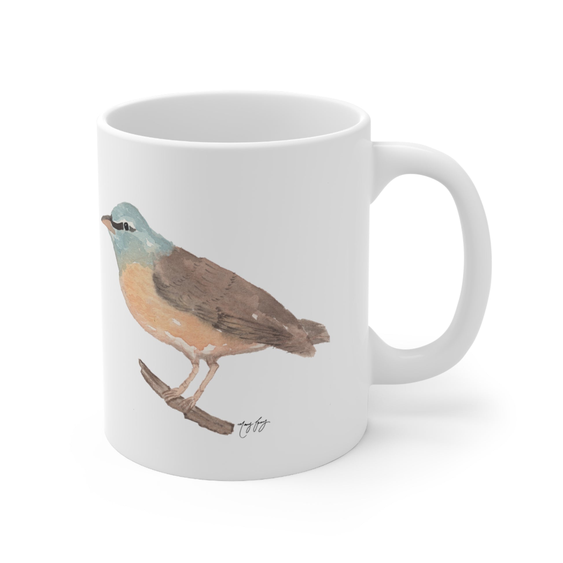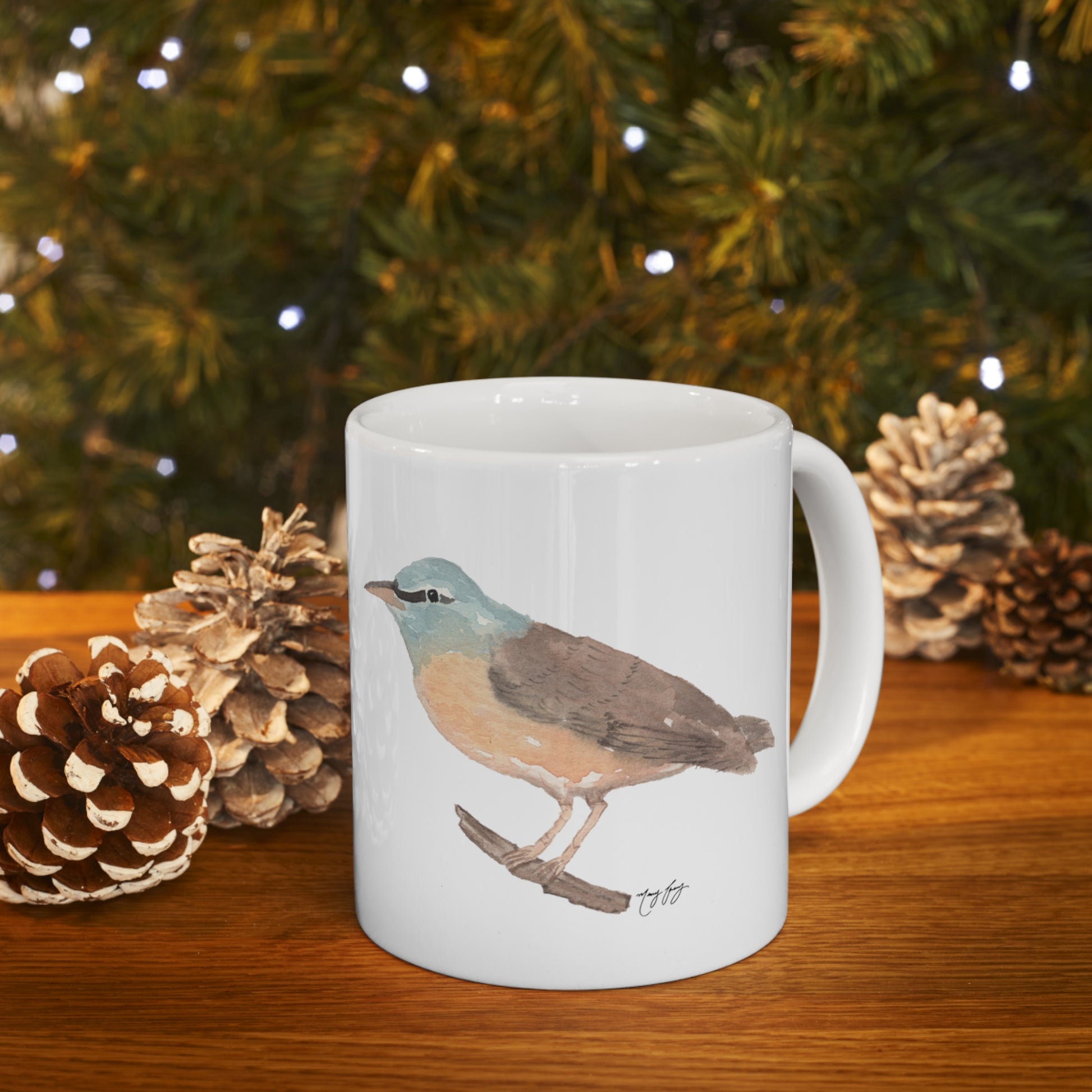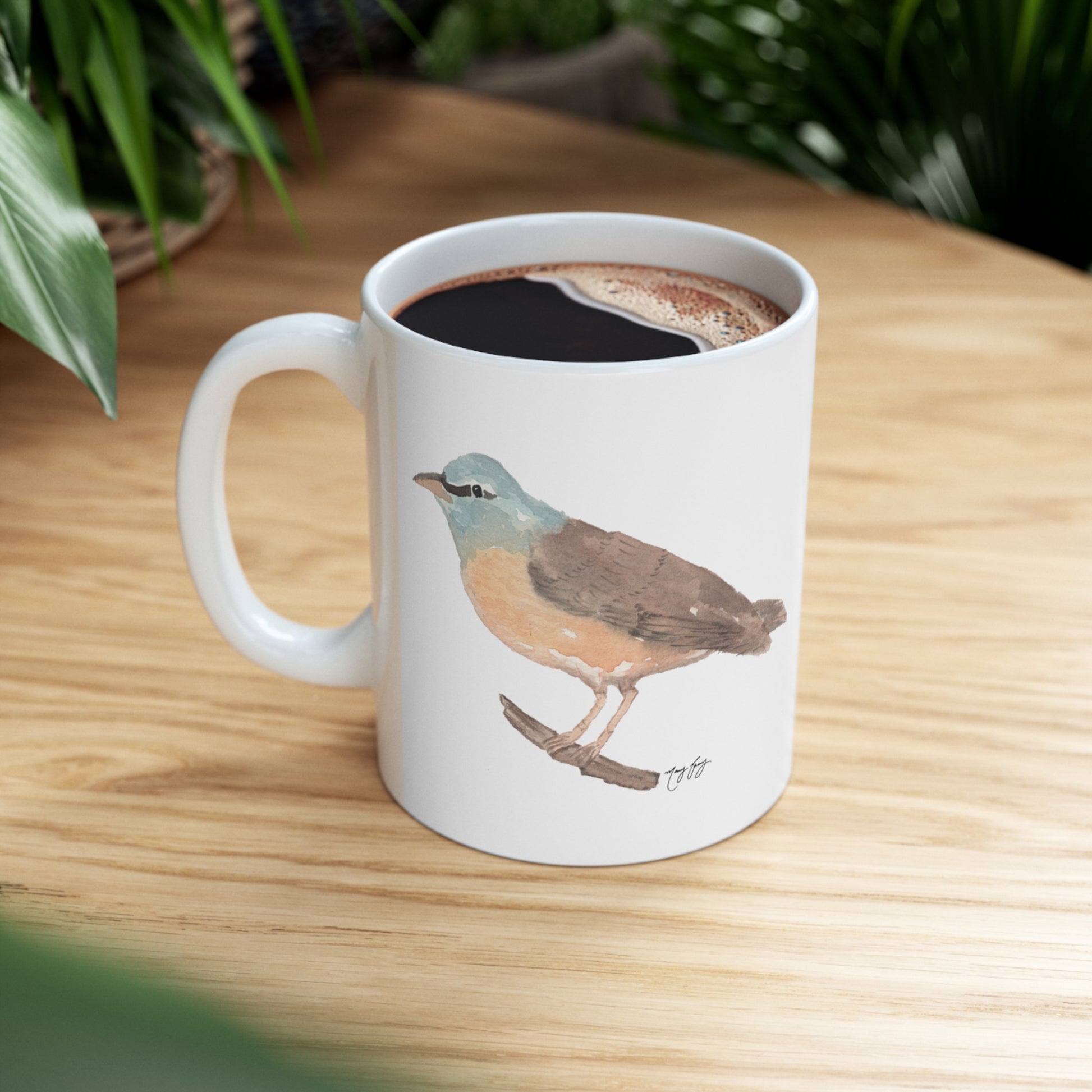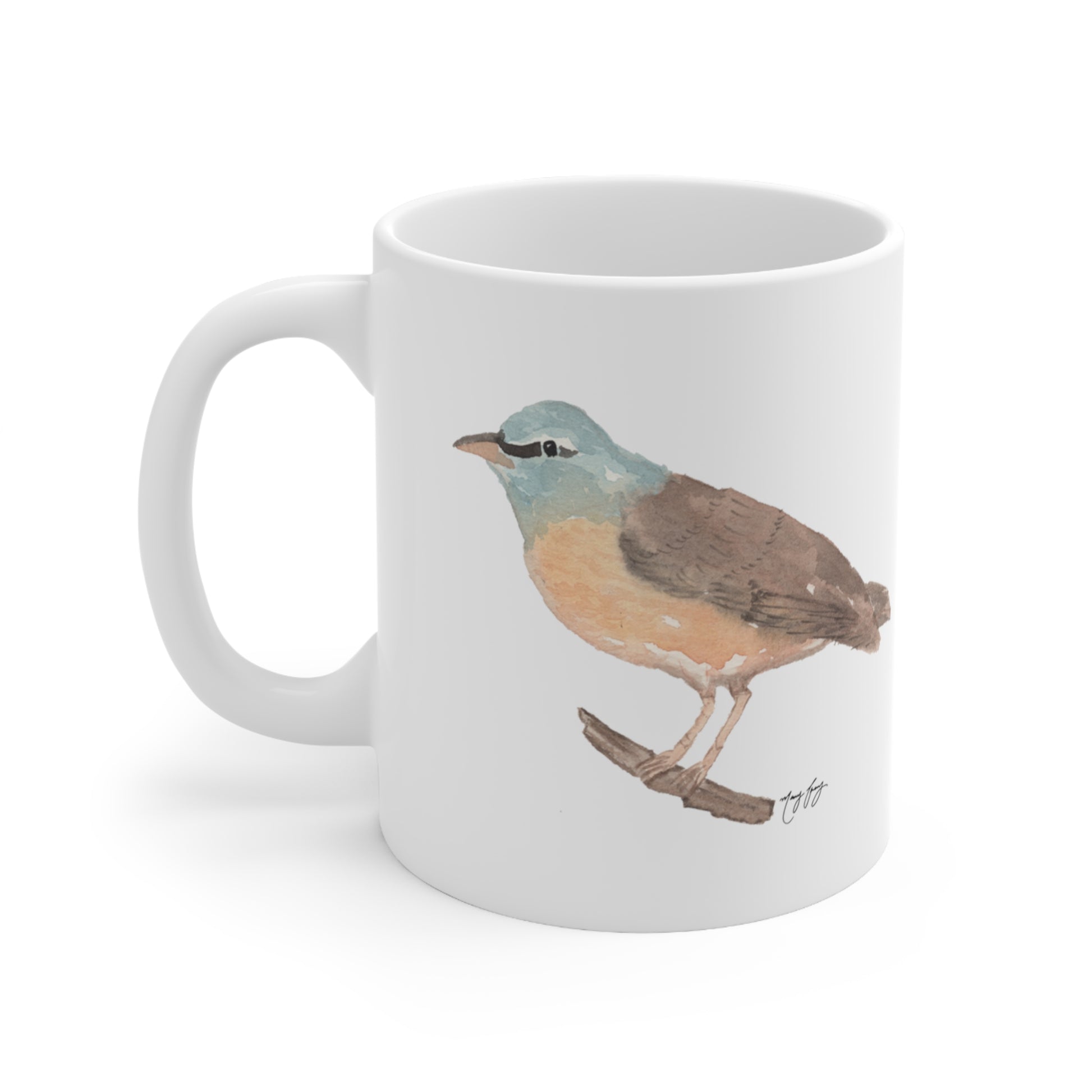 Warm-up with a nice cuppa out of this customized ceramic coffee mug. It’s BPA and Lead-free, microwave & dishwasher-safe, and made of white, durable ceramic in 11-ounce size. Features full color printing of Mary Frey's watercolor "Eyebrowed Thrush" painting!