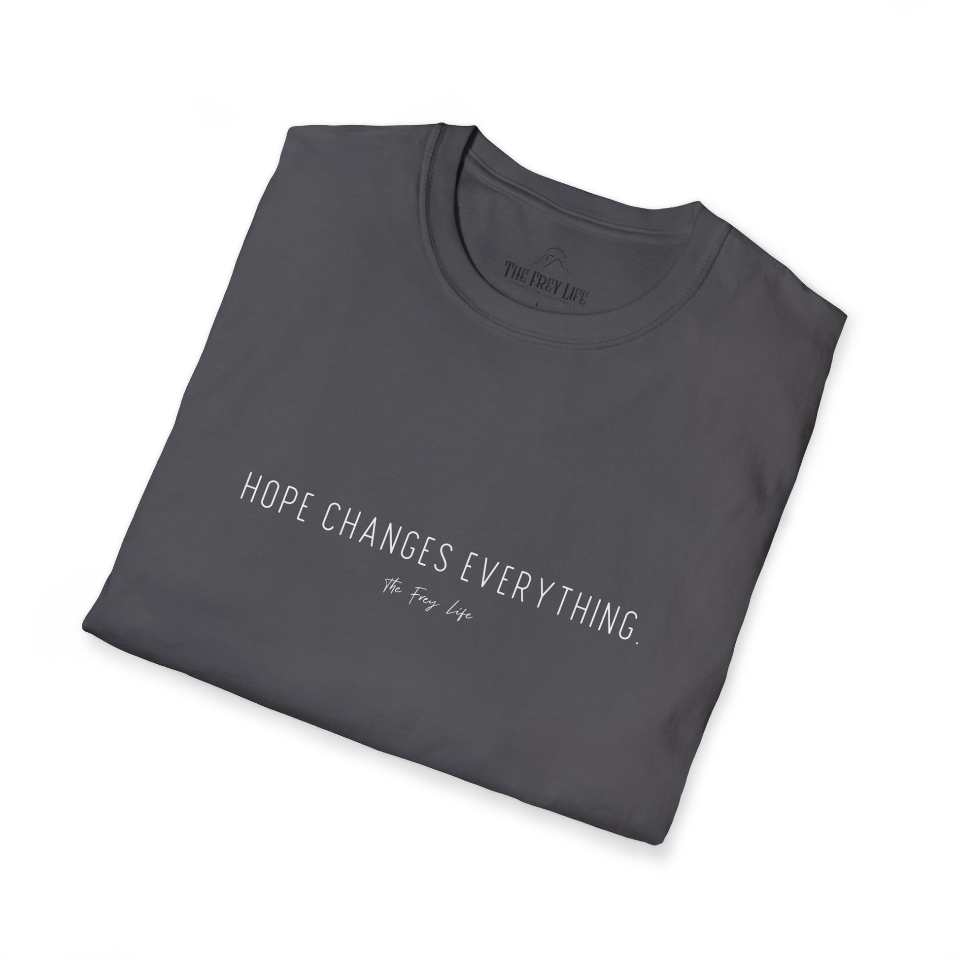 The unisex soft-style t-shirt puts a new spin on casual comfort and is designed to remind you that hope changes everything. Made from very soft materials, this tee is 100% ringspun cotton. The shoulders have twill tape for improved durability. There are no side seams. The collar is made with ribbed knitting to prevent curling damage.
