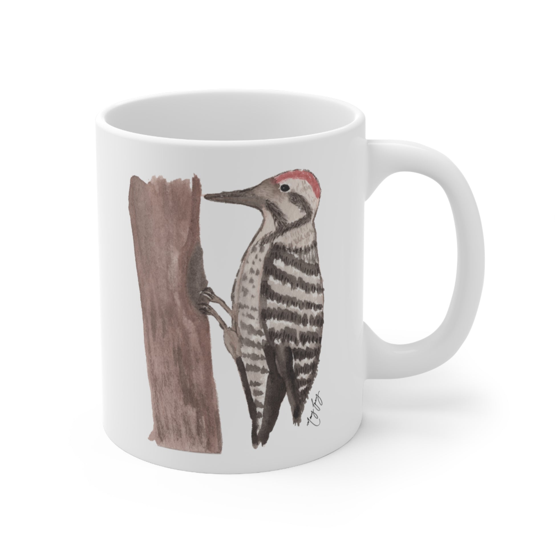 Warm-up with a nice cuppa out of this customized ceramic coffee mug. It’s BPA and Lead-free, microwave & dishwasher-safe, and made of white, durable ceramic in 11-ounce size. Features Mary Frey's watercolor "Woodpecker" painting.